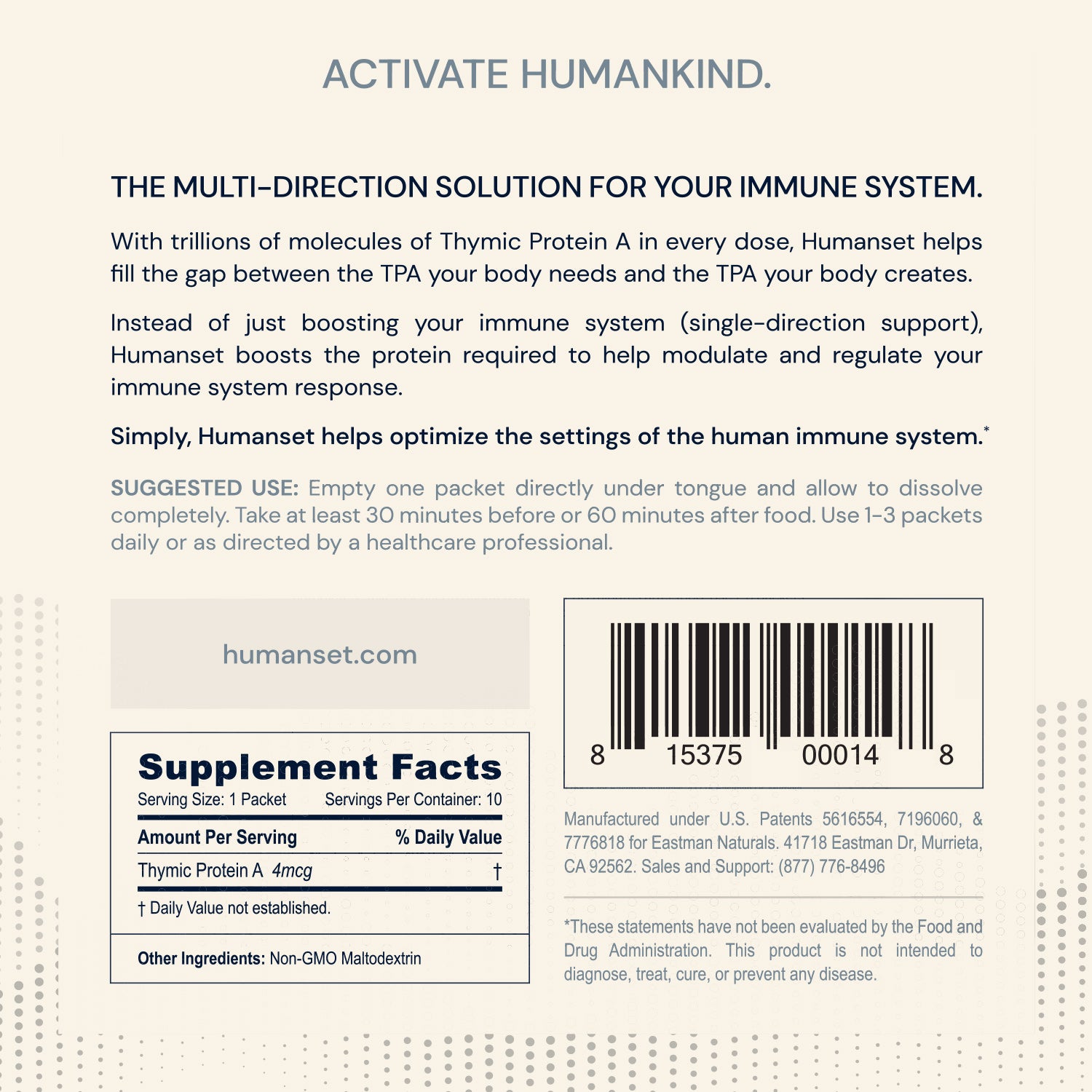 Discover the original and purest form of Thymic Protein A with our convenient 10-count trial of Humanset TPA Powder Packets. Experience the rapid absorption of our sublingual powder, designed to quickly introduce immune-modulating benefits and help you assess how TPA can support your optimal immune function.